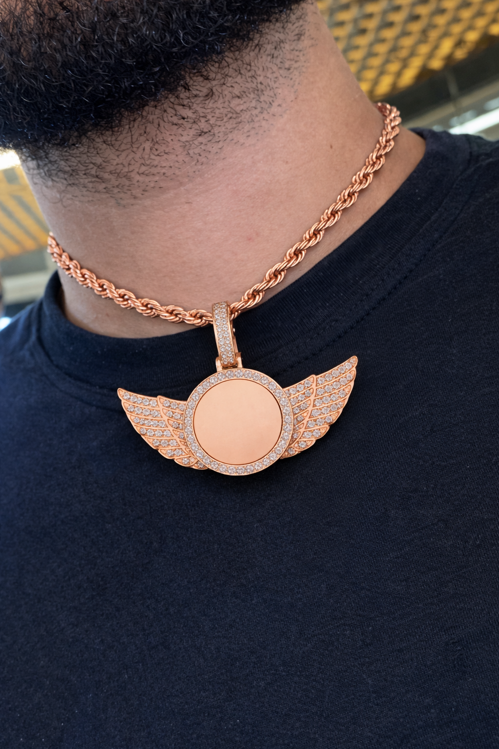This premium pendant features a sleek circular center framed with brilliant diamonds and beautifully crafted angel wings on both sides, symbolizing power and freedom.